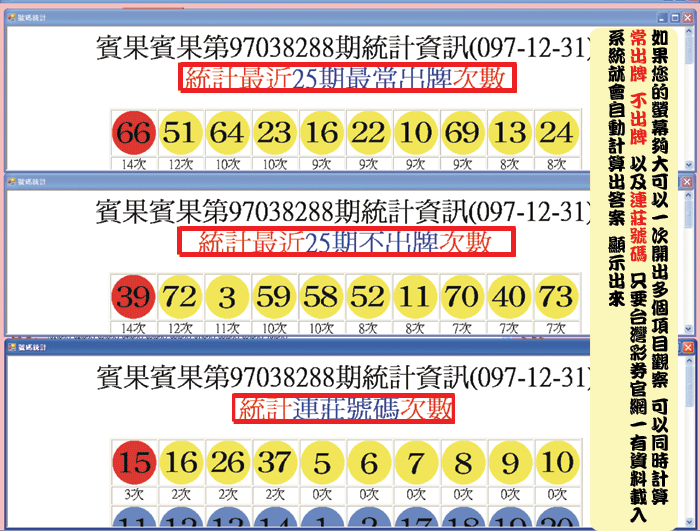 範例顯示連莊號碼29號最多次