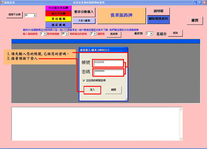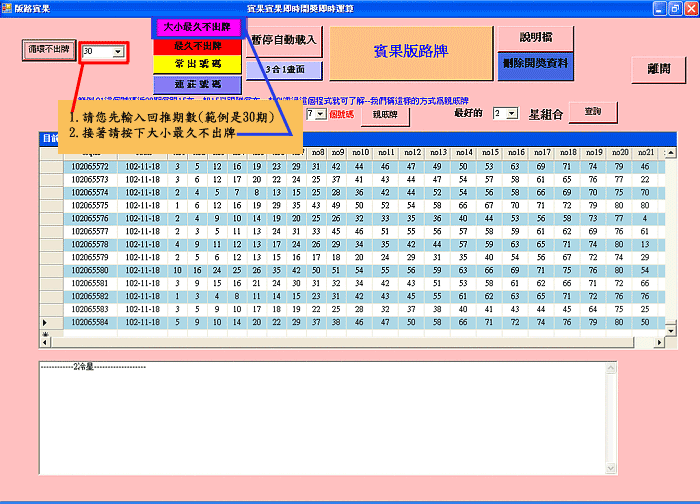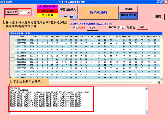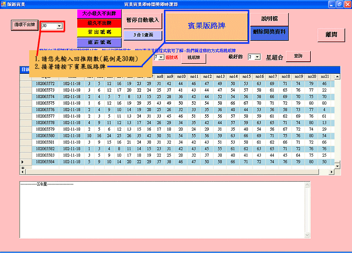 賓果版路軟體結合台灣彩券網頁 同時提供即時開獎號碼 只要點選分析期數 就可以直接點選要分析的項目 能夠在短短的幾秒鐘時間 提供分析資料無須複雜操作 可算出最久不出的號碼 以及最常開出的號碼 可自行設定期數 軟體下載完後,請直接來電04-22371897告知我們 我們會協助您建立帳號和密碼 安裝方式請看以下教學